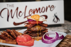 7. Build each burger, starting with a slice of bread, a smear of mayo, a burger patty, 4 slices of bacon, a sausage patty, more bacon, some tomato, onions (if you like), an egg, and a second slice bread. Enjoy!